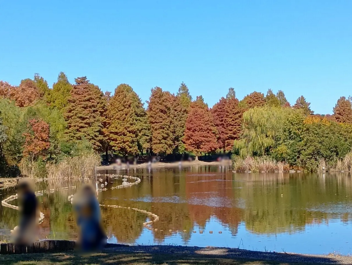 広大な舎人公園には大きな池があり、対岸の木々が赤や黄色に色づいて水面に映る様子は息をのむ美しさ!都心からこんなに手軽に来られる場所で、こんなに立派な紅葉が見られるなんて感動です。
