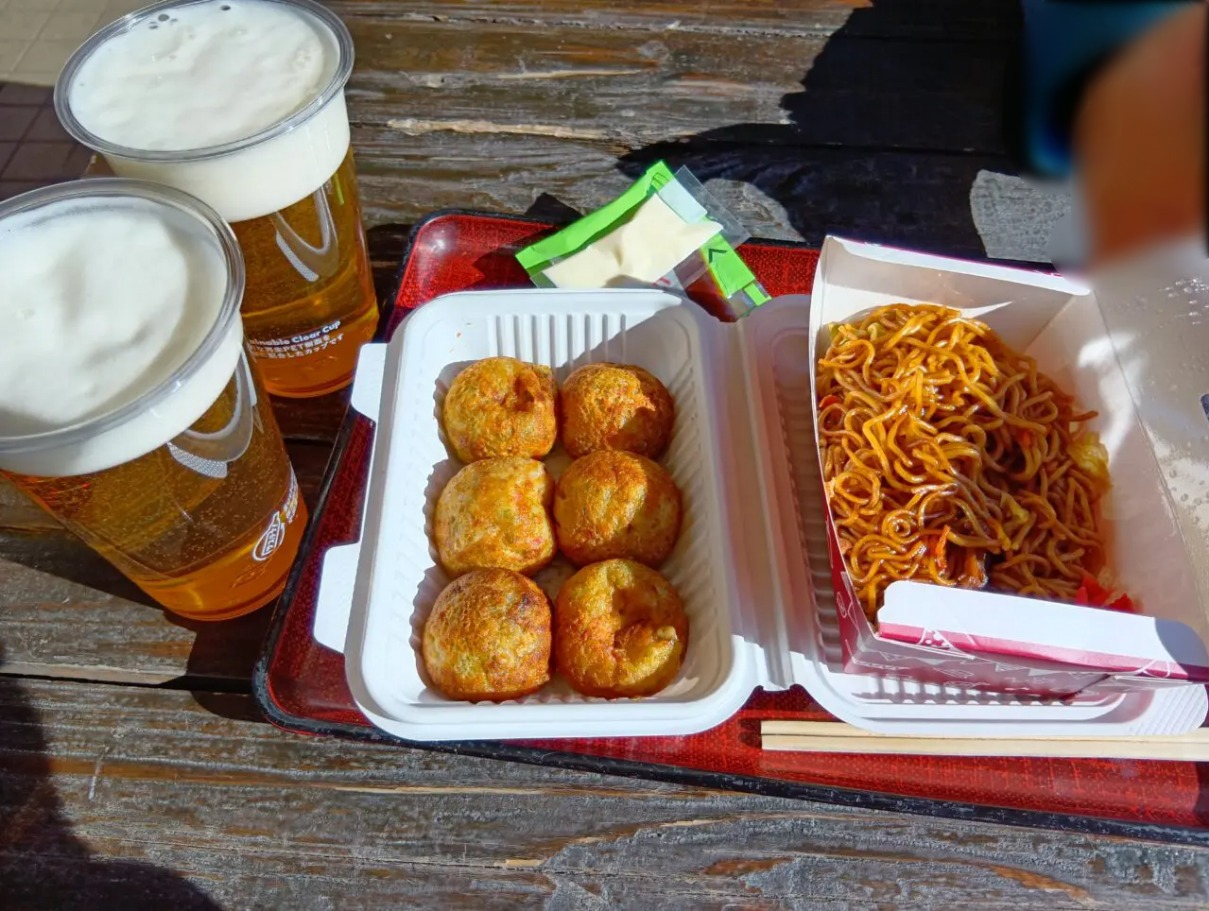 屋外でいただく出来立てのたこ焼きと焼きそば、電車来ているのでコレ!