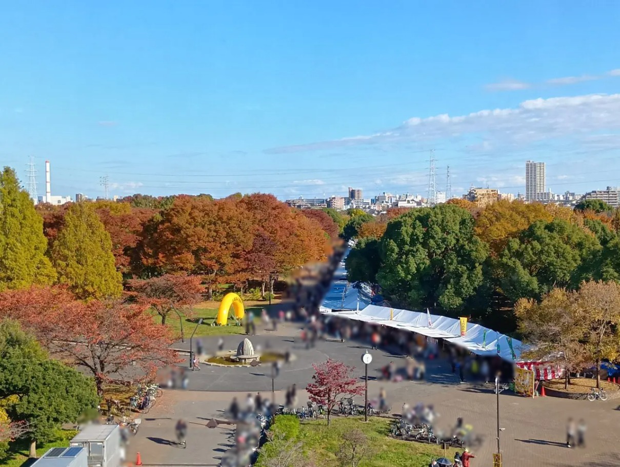 そして、ここで一つ驚きの発見が!実は舎人公園、公園の真ん中に日暮里・舎人ライナーの駅があるんです。そのホームから見下ろした景色がこちら。陶器市と、両サイドの紅葉が一度に見られる絶景ポイントでした!