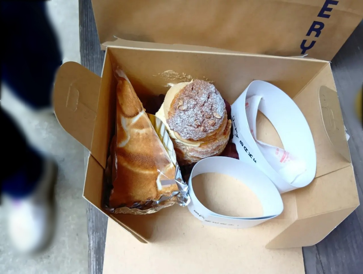 美しい紅葉を堪能した後は、境内のベンチで休憩です。ここで登場するのが、東京駅で買ってきた「シティーベーカリー」のスイーツたち!