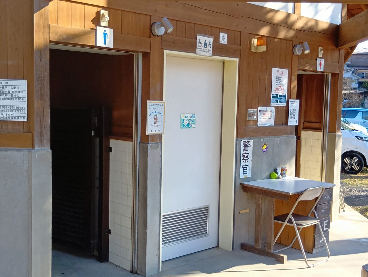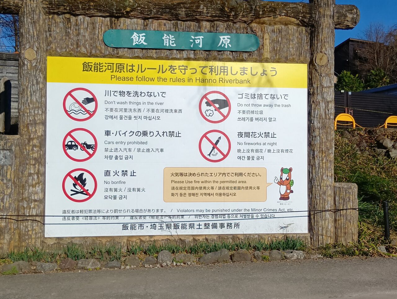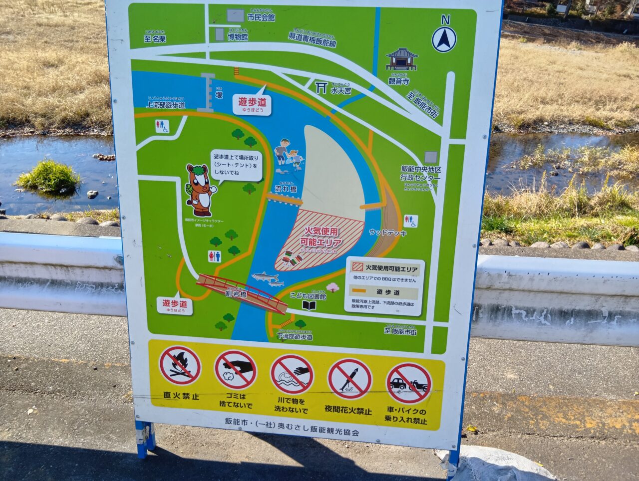 まず河原に降り立つと目に飛び込んでくるのが、エリアの案内看板です。実はここ、ハイシーズン(春〜秋)は有料のバーベキューサイトとして運営されていますが、オフシーズン(冬季など)は、なんと指定のエリアで火気使用が「無料」で利用できるんです!