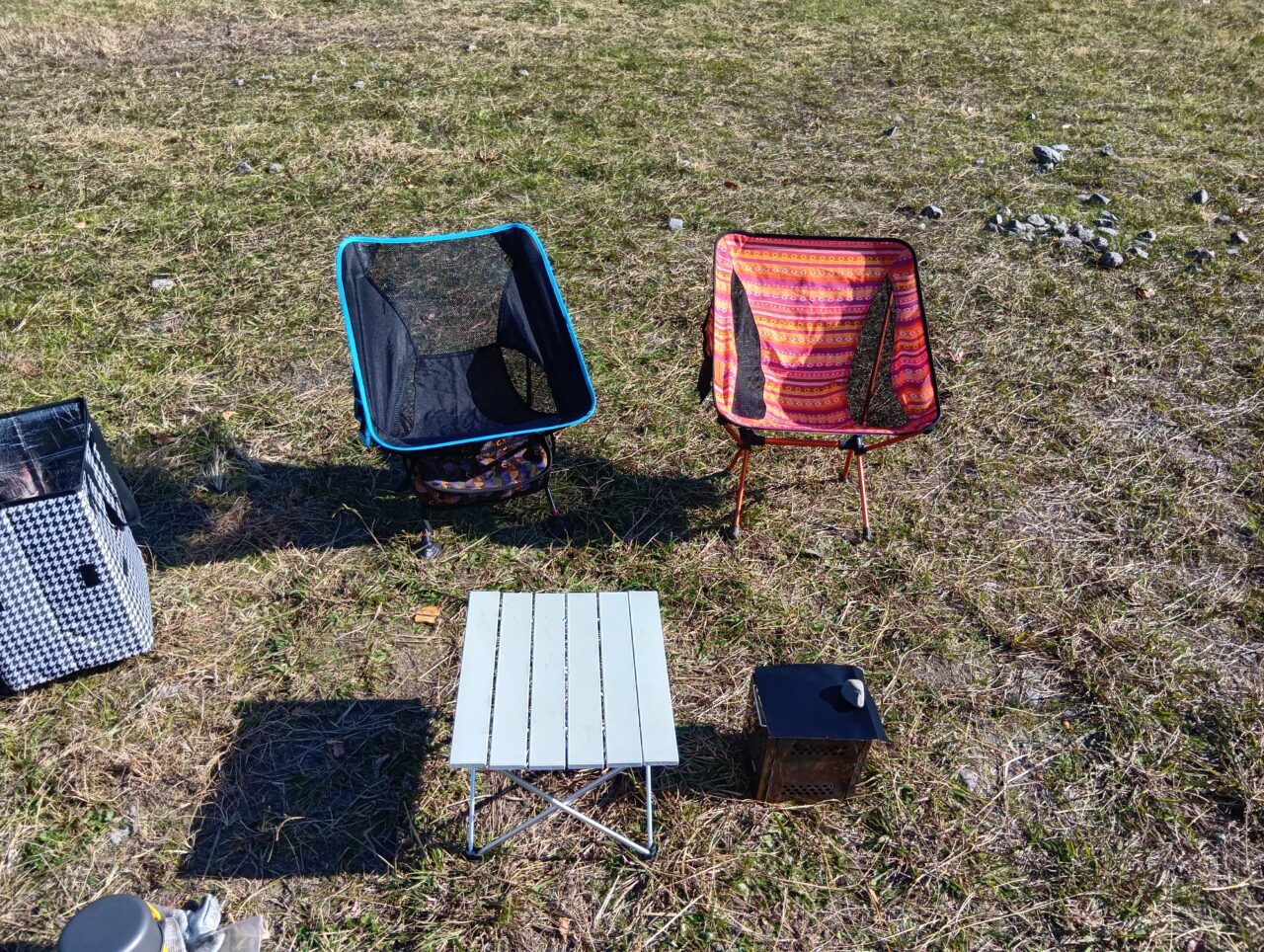 今回のセッティングは、イス、テーブル、そしてコンパクトな焚火台のみ。あえてタープは張りませんでした。冬の日は貴重です。日陰を作ってしまうと、ただでさえ寒いのが余計に寒くなってしまいますからね。