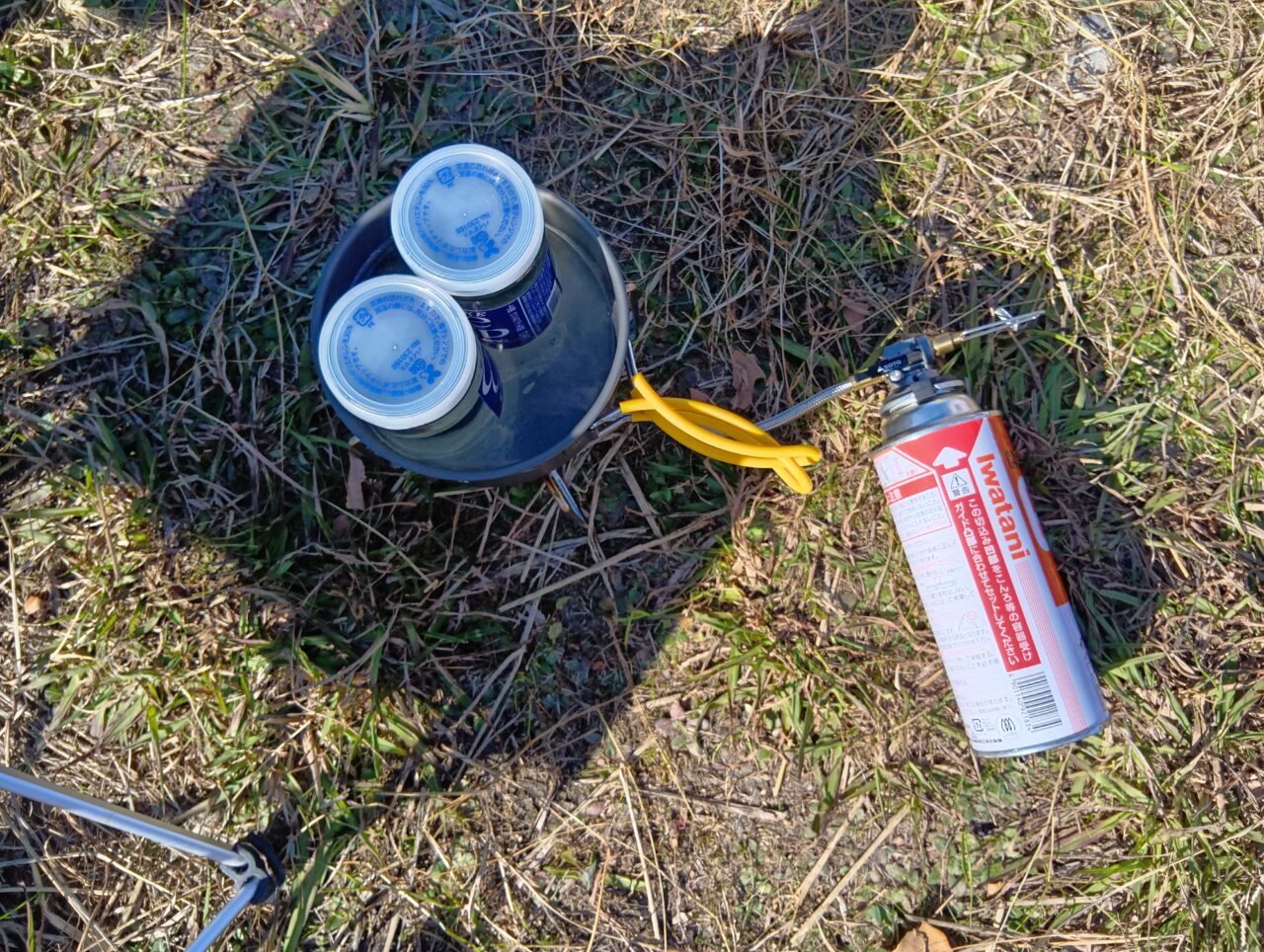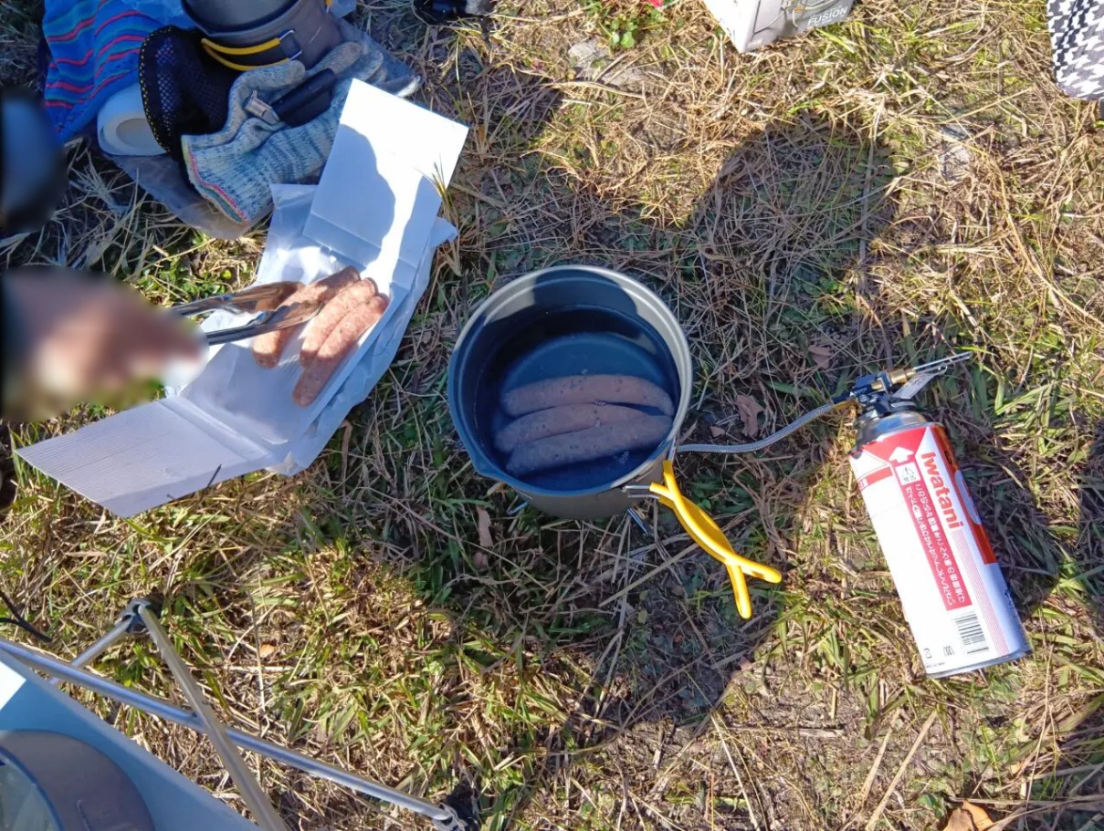 ソーセージを頬張りながら、空いたクッカーにワンカップをセット。お湯に浸して「熱燗」を作ります。冷えた体に、温かい日本酒が染み渡ります。