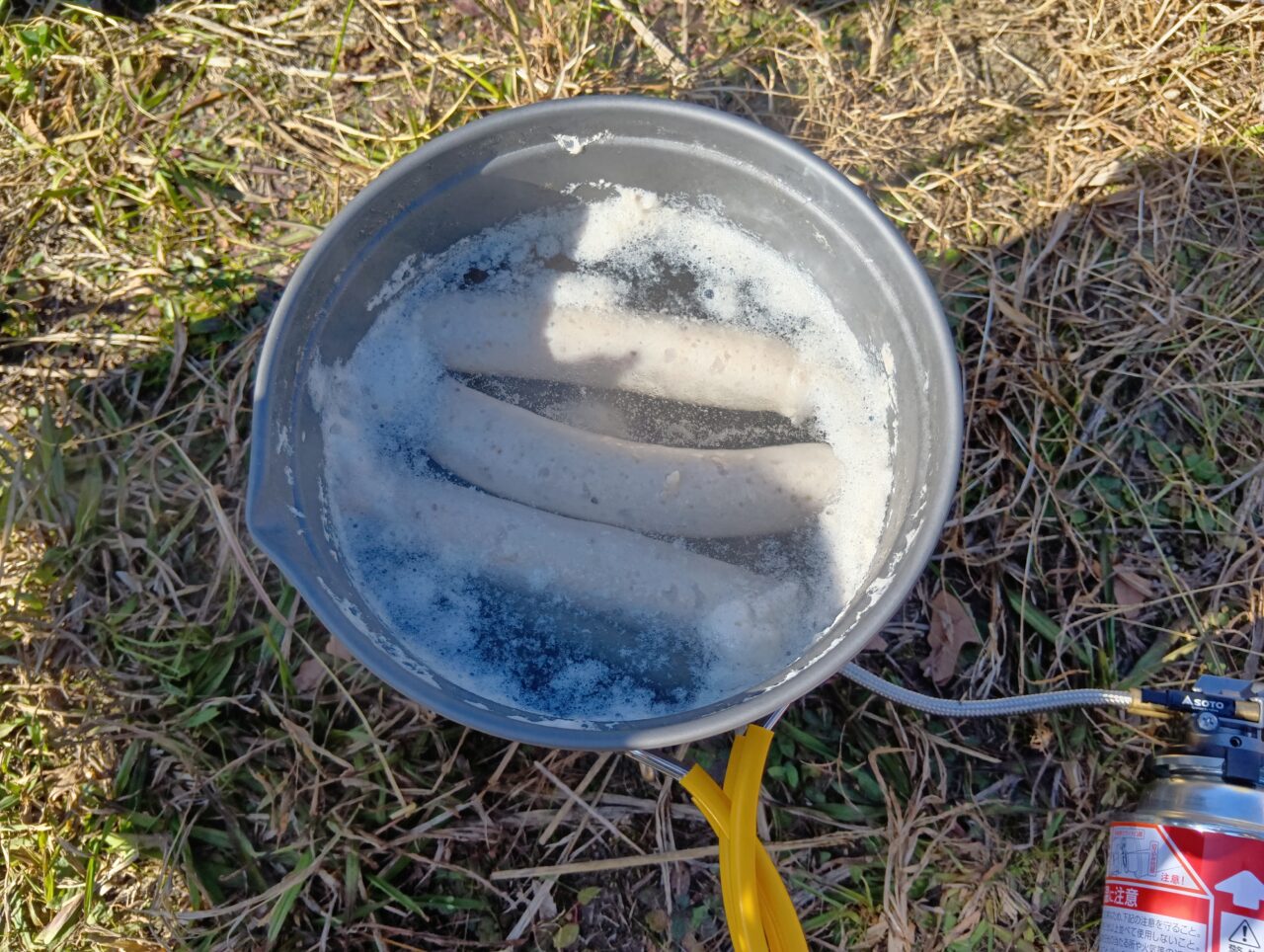 まずはボイルです。クッカーでお湯を沸かし、生ソーセージを茹でます。