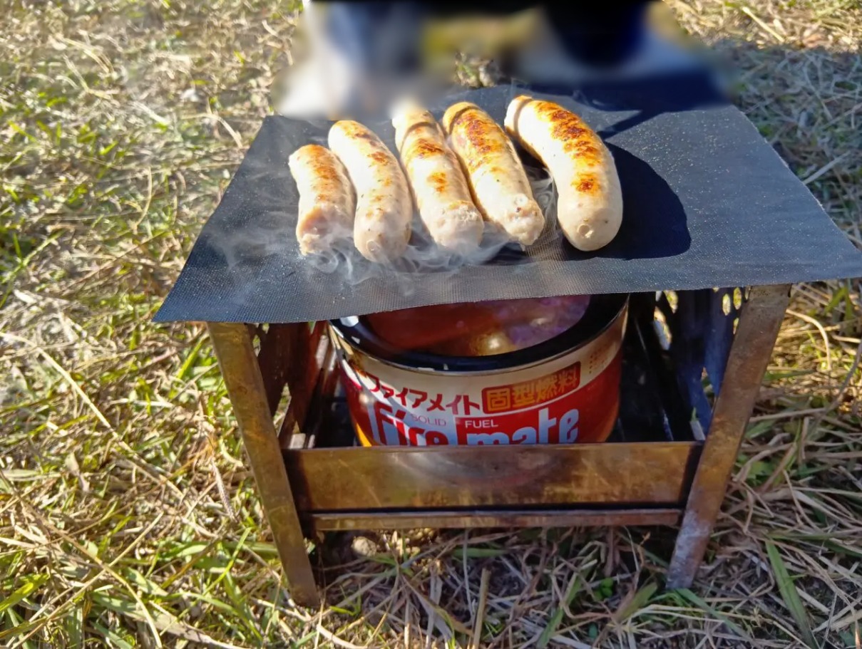 このシート、網を汚さないので後片付けが劇的に楽になります。ファイヤーメイトの優しい火力がシート越しに伝わり、ソーセージの表面がパリッと弾けます。一口かじると、じゅわっと肉汁が……!