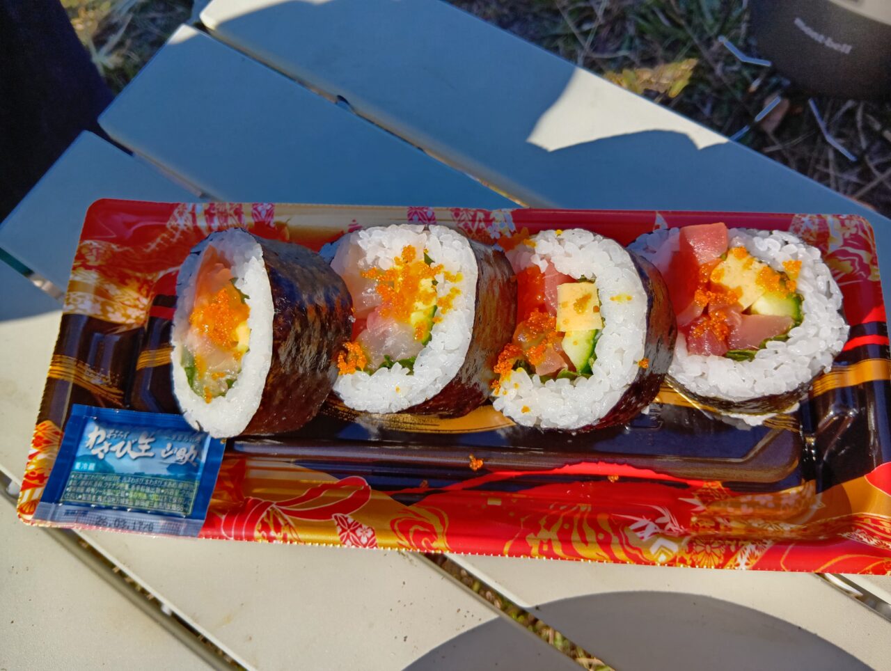 美味しいものをゆっくりと、自分のペースで食べる。プチバーベキューの醍醐味ですね。お肉と熱燗でかなり満足感がありますが、最後に気になって買ってしまった「巻きずし」をいただきます。