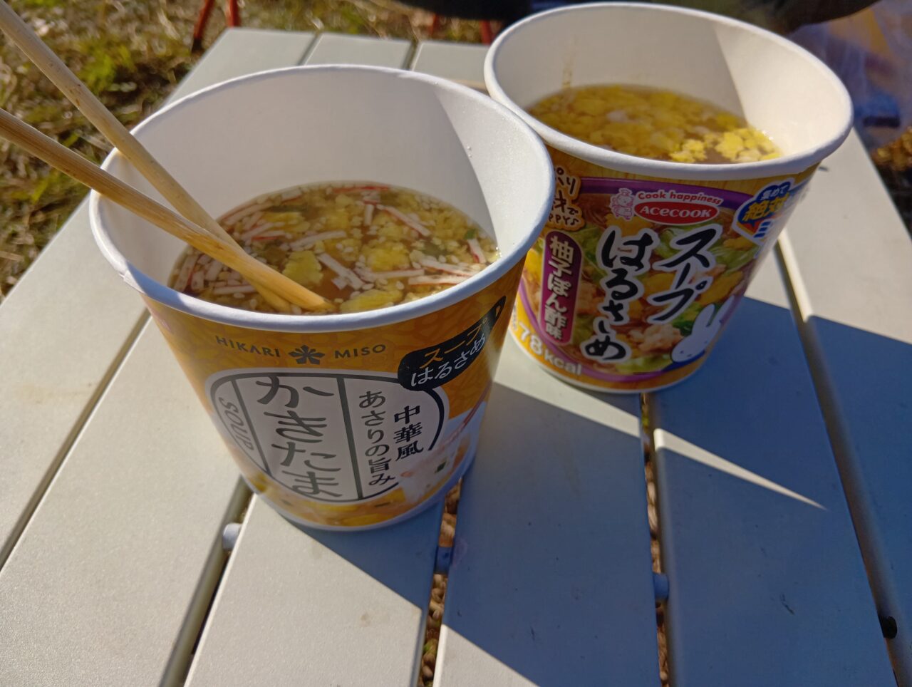 仕上げは、お湯を注ぐだけのカップスープ。温かいスープで胃を落ち着かせたら、本日の宴は終了です。